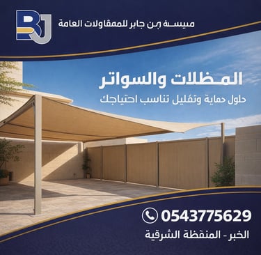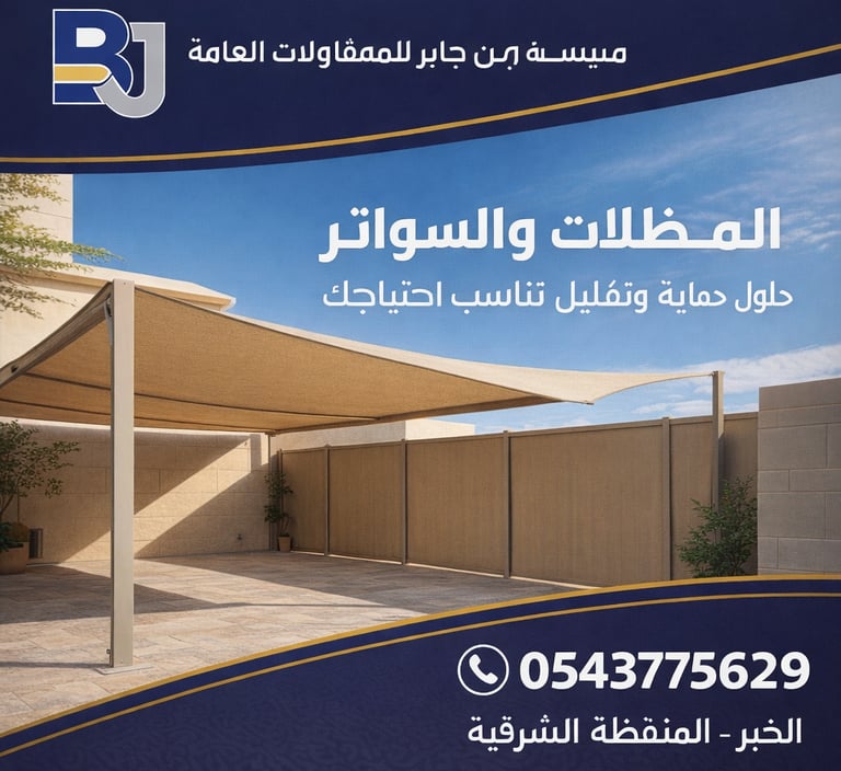 في مؤسسة بن جابر للمقاولات العامة، نحرص على تقديم حلول مناسبة في أعمال المظلات والسواتر بما يتوافق مع احتياجات العملاء، سواء للمنازل، الفلل، الاستراحات، المواقف، المنشآت التجارية، أو المساحات الخارجية المختلف